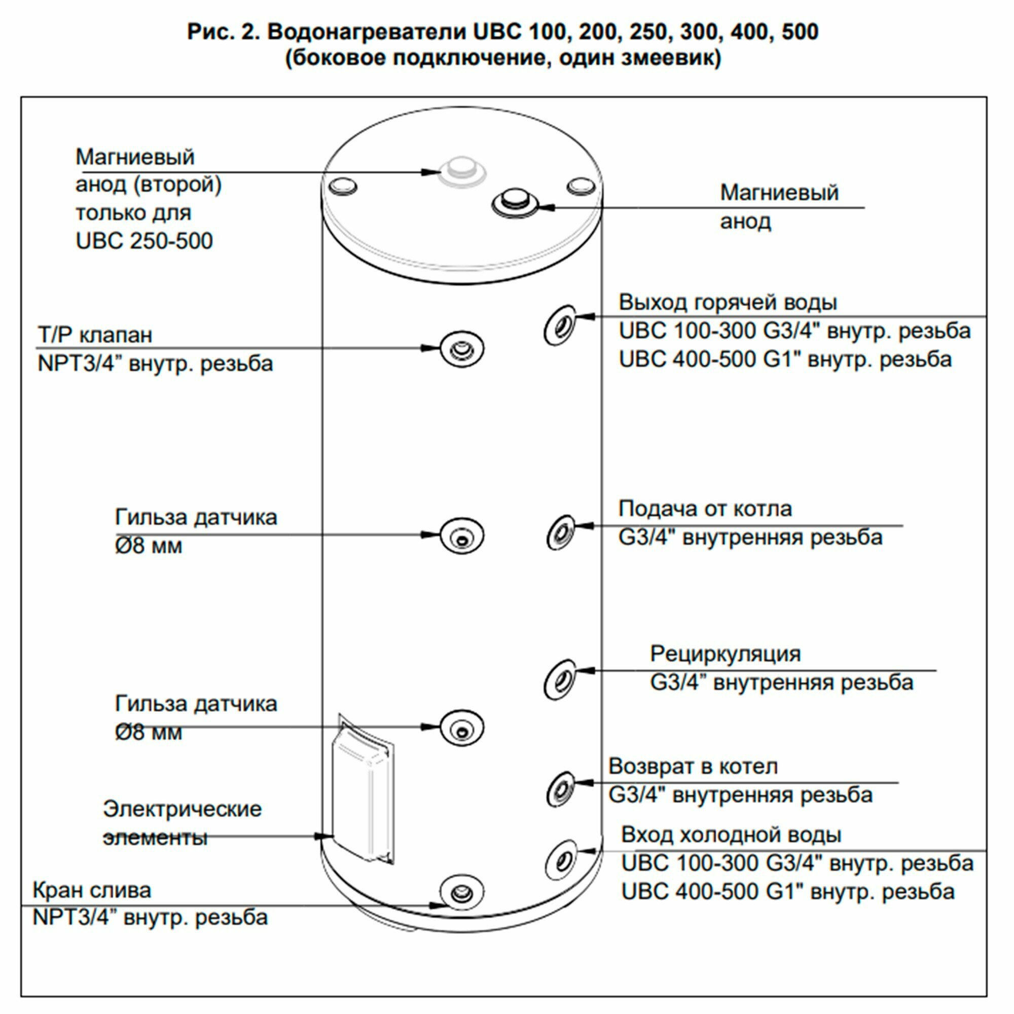Внешние накопительные бойлеры серии UBС — это высокоэффективные эмалированные стальные водонагреватели емкостью от 100 до 500 литров. Стенки и змеевик бойлера покрыты запатентованной высококачественной эмалью. Для дополнительной защиты от коррозии бойлеры оснащены магниевыми анодами. Благодаря изоляции из пенополиуретана толщиной от 40 до 50 мм (в зависимости от емкости) потери тепла минимальны. Широкий модельный ряд дает возможность выбрать бойлер, оптимально подходящий для вашего комфорта.• Тип бойлера: эмалированная сталь • Тип установки: напольнаяКонструктивные особенности и преимущества:• Материал бака и змеевика: углеродистая сталь• Внутреннее покрытие бака: запатентованная эмаль• Двустороннее эмалирование змеевика• Твердая облицовка с покрытием белой эмалью• Две гильзы с фиксаторами для датчика температуры бойлера• Электрический ТЭН из нержавеющей стали AISI 304L мощностью 3 кВт во всех моделях• Два предохранительных клапана и кран слива в комплектеШирокий модельный ряд:• Модели с боковом подключением от 100 до 500 л• Модель 150 литров с верхним подключением• Модели как с одним, так и с двумя змеевиками (DC)Высокая энергоэффективность• Высокопроизводительный змеевик мощностью от 24 до 40 кВт (в зависимости от модели)• Теплоизоляция из вспененного пенополиуретана толщиной 40 или 50 мм (в зависимости от модели)• Второй змеевик в верхней части (у моделей UBC DC)Надежность и безопасность:• Сбросной предохранительный клапан с функцией обратного клапана на входе холодной воды• Комбинированный предохранительный клапан по температуре и давлению• Рабочий термостат и предохранительный термостат от перегрева для контроля за работой электрического нагревательного элемента (ТЭНа)• Магниевый анод увеличенного размера для дополнительной защиты от коррозии*• Высококачественное порошковое эмалирование запатентованным составом***У всех моделей от 250 литров и у моделей с двумя змеевиками установлены два магниевых анода**Эмалированы следующие компоненты водонагревателя: внутренний бак, змеевик, нагревательный элемент. Эмалирование нагревательного элемента (ТЭНа), выполненного из нержавеющей стали, максимально уменьшает скорость образования накипи на гладкой поверхности ТЭНа. Двустороннее эмалирование змеевика обеспечивает высокую теплопередачу и высокое качество нагреваемой воды (без следов ржавчины) Артикул товара: НС-1629333. Заказывайте это оборудование на климатическом маркетплейсе conditioner.market. Мы обеспечиваем прозрачность сделки, прямые поставки от вендоров и официальную гарантию завода-изготовителя.