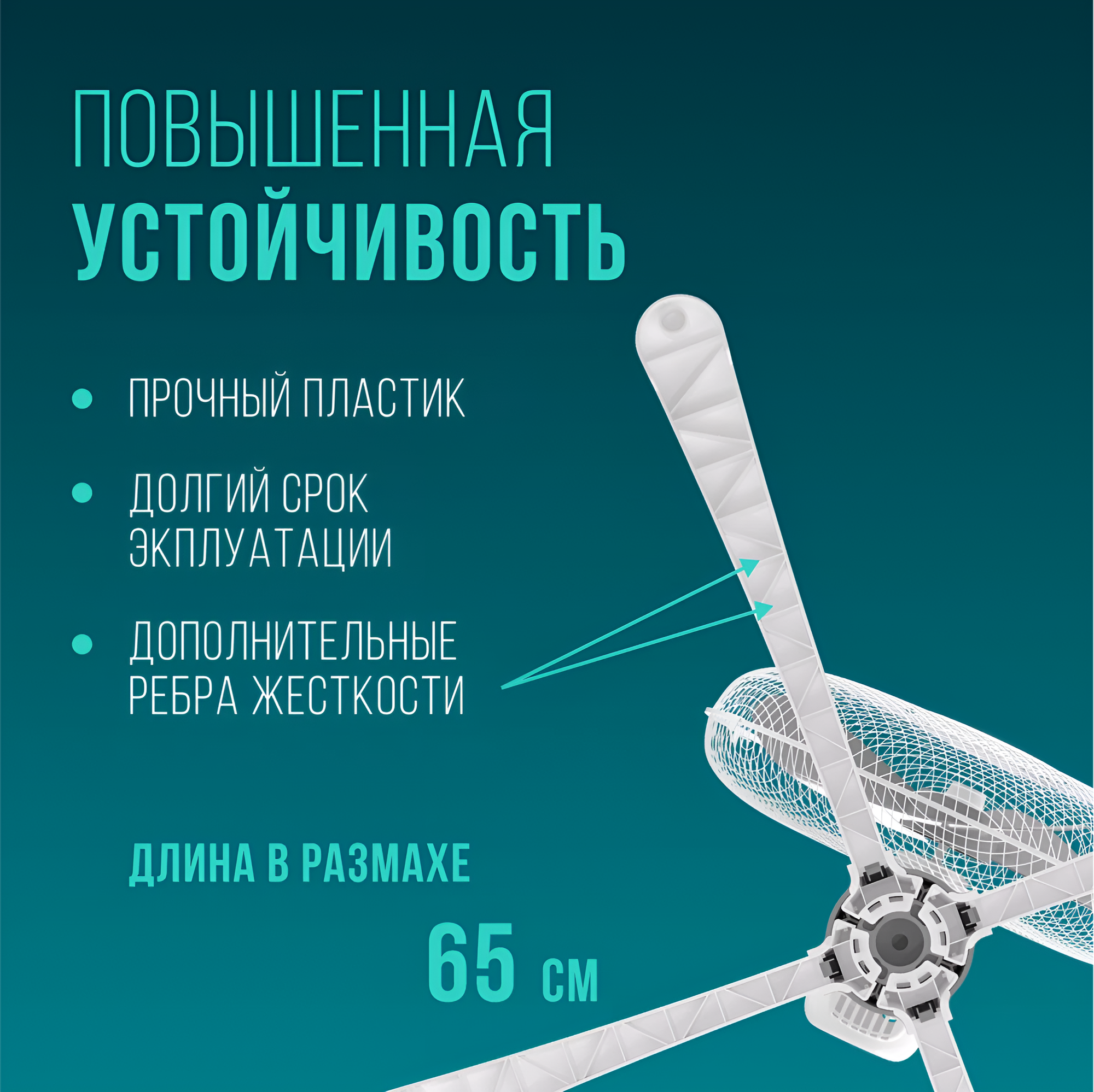 Вентилятор отличается высокопрочными ножками, форма которых обладает повышенной устойчивостью благодаря строению и длине 65 см.
