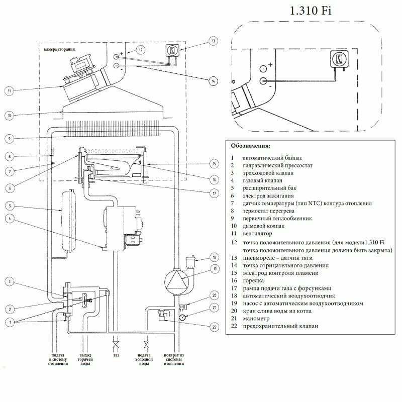 - Датчик тяги (пневмореле — для моделей с закрытой камерой, термостат — для моделей с открытой камерой);