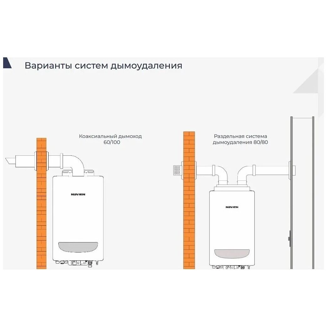 Были изменены присоединительные размеры камеры сгорания к дымоходу, и сейчас для подключения коаксиального комплекта диаметром 60/100 не требуется переходник с 75-го диаметра, а это значит что к нашим котлам теперь подходит универсальный дымоход и нет необходимости приобретать специальный коаксиал Navien