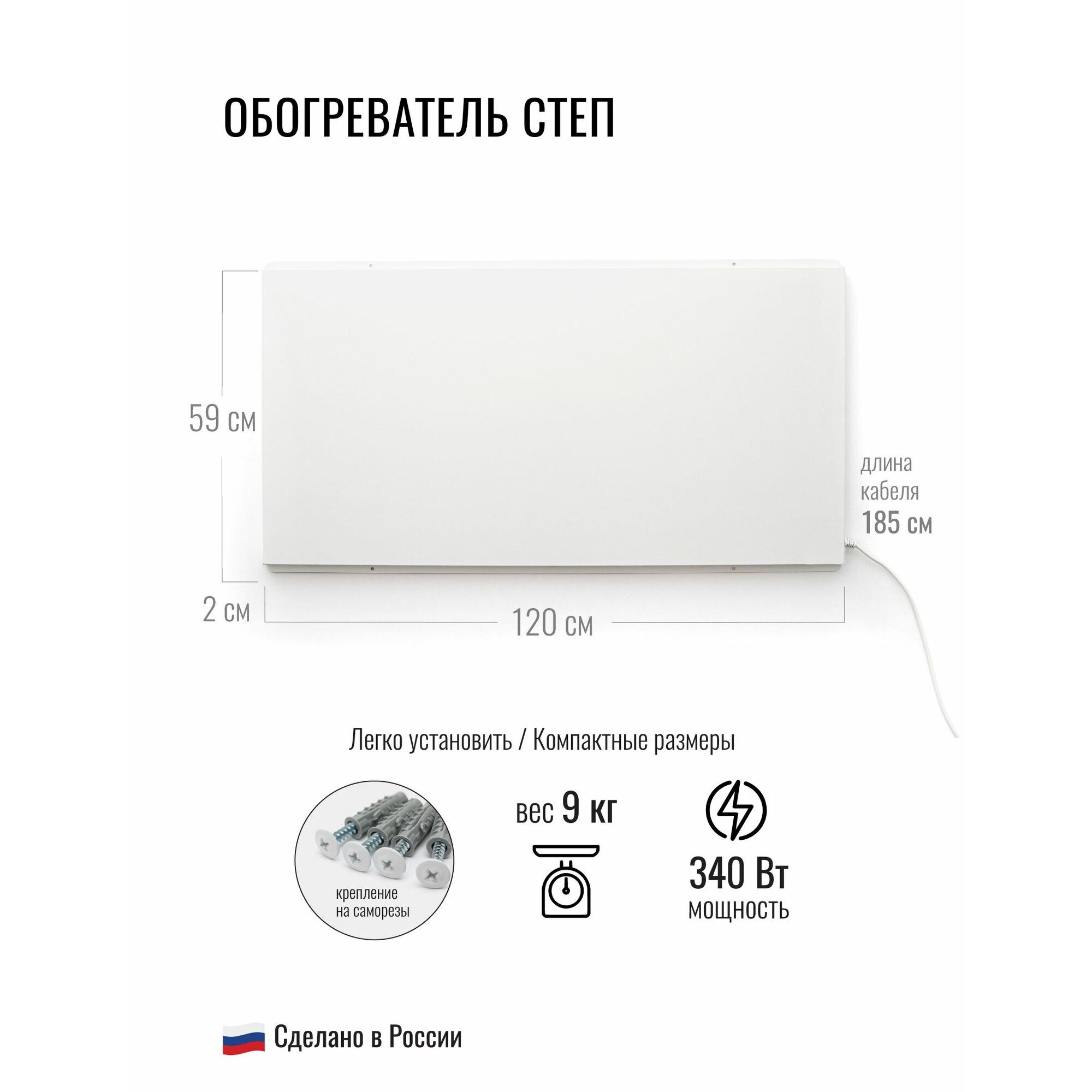 Технические характеристики обогревателя включают мощность 340 Вт, что позволяет поддерживать комфортный тепловой режим в любом помещении. Он обладает влагозащитным и пыленепроницаемым корпусом, что делает его идеальным для использования в автомойках, теплицах и промышленных помещениях. Обогреватель создаёт тепло без шума и запаха, благодаря применению качественных отечественных комплектующих.