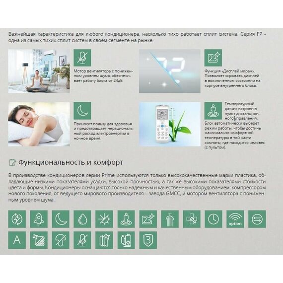 Серия кондиционеров Prime - новинка сезона 2019 года. В производстве кондиционеров используются только высококачественные марки пластика, обладающие низкими показателями усадки, высокой прочностью, а так же высокими показателями стойкости цвета и формы. Кондиционеры оснащаются только надёжным и качественным оборудованием: компрессором нового поколения, от ведущего мирового производителя – завода GMCC, и мотором вентилятора с пониженным уровнем шума.