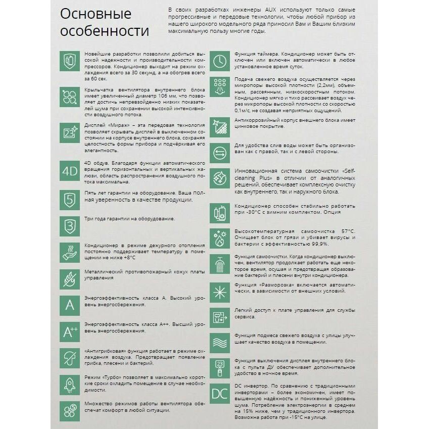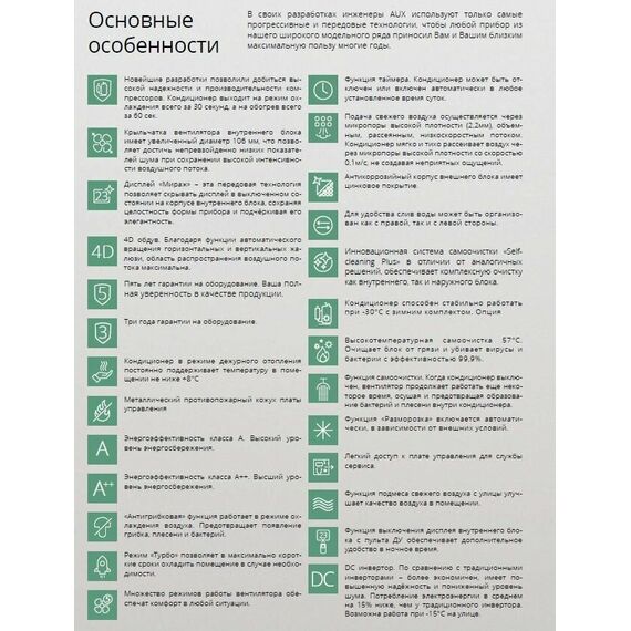 Режимы работы: охлаждение, обогрев, осушение, вентиляция, авторестарт, противогрибковая функция, авторазморозка, самоочистка, самодиагностика 360°, функция защиты от утечки фреона, турбо режим, глубокий сон, таймер, iFeel, дисплей «Мираж», идентификация кода неисправности, вывод дренажа в две стороны, антикоррозийное покрытие Blue Fin, выключение дисплея с пульта ДУ, компрессор GMCC, wi-fi (опция). Гарантия 3 года.