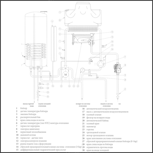 - Защитный термостат от перегрева воды в первичном теплообменнике;