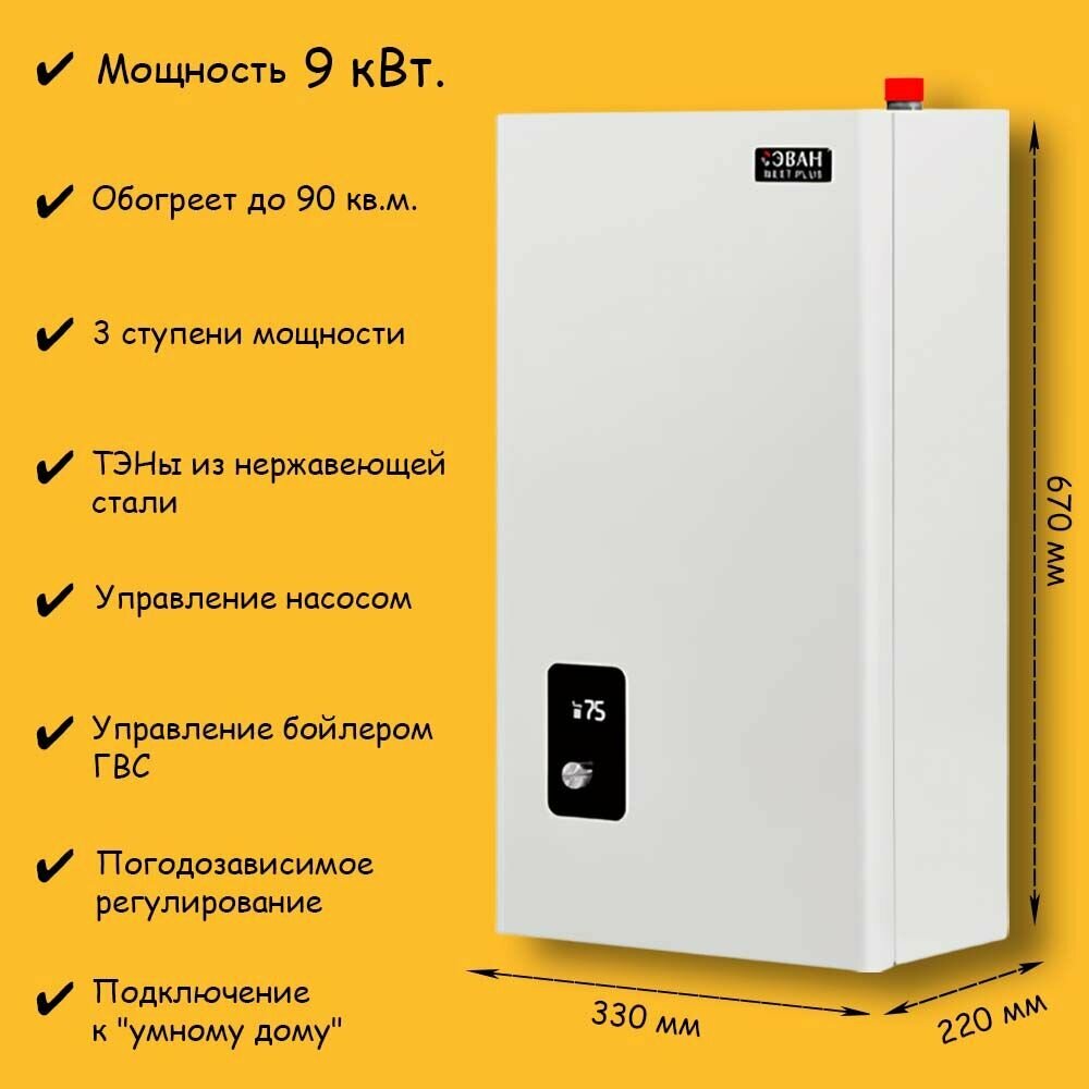 Электроотопительный котел ЭВАН NEXT Plus 9 кВт предназначен для отопления дач, частных домов, небольших торговых и складских помещений. Он может использоваться в качестве резервного источника тепла в паре с газовым или твердотопливным котлом.