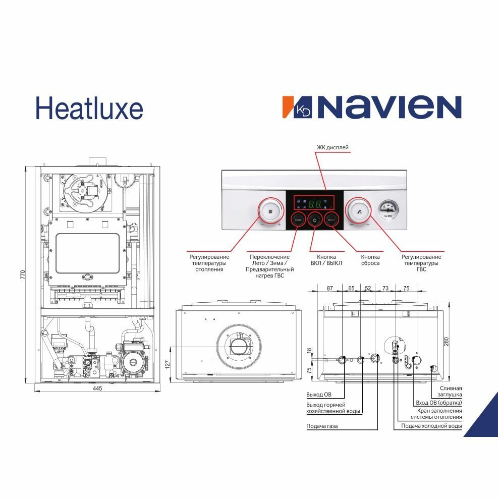 Гидрогруппа котла выполнена из латуни по «европейской» схеме расположения патрубков. Navien Heatluxe NGB210 можно установить вместо устаревшего газового котла европейских производителей с минимальным вмешательством в систему отопления и водоснабжения дома.