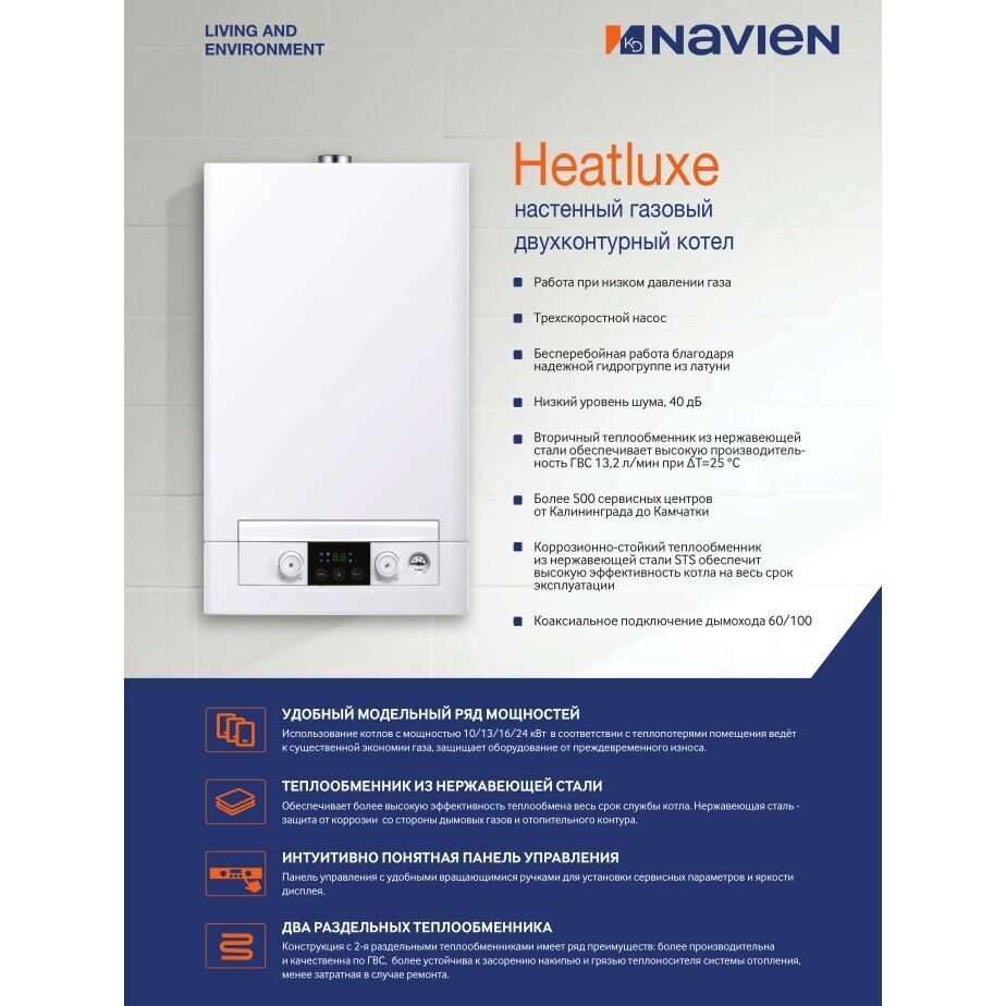 Настенный газовый котёл Navien Heatluxe NGB210 — новинка от Navien на российской рынке. Это первый котёл Navien в России, который выпускается на собственном заводе в Пекине. На заводе существует специальная лаборатория, которая следит за соблюдением стандартов производства и качества, установленными для всей продукции Navien.