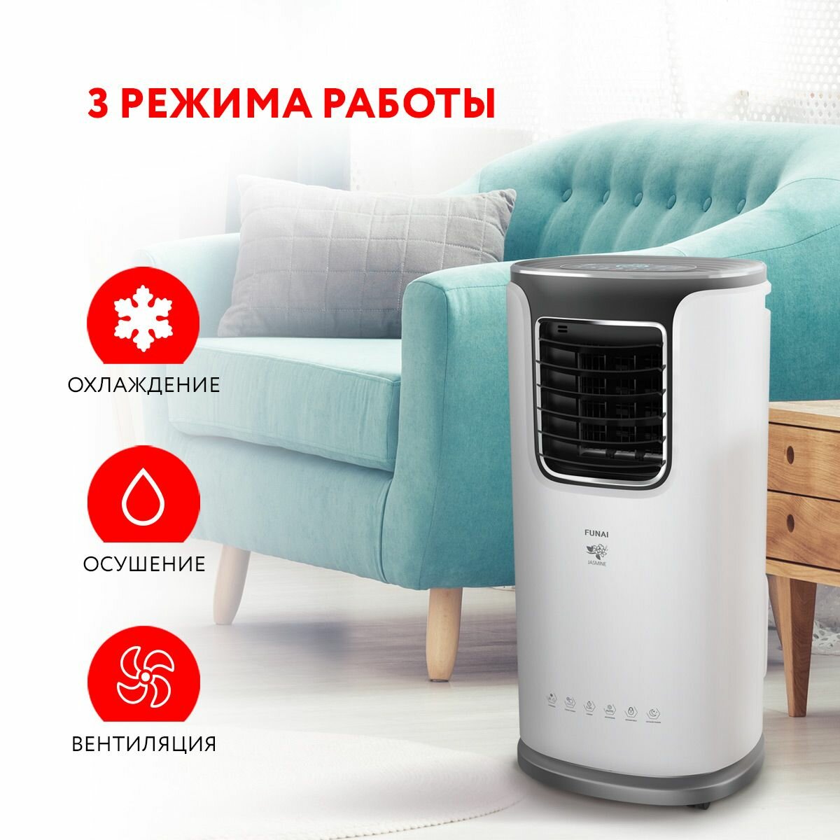 - режимы работы. Мобильные кондиционеры серии JASMINE имеют 3 режима работы: охлаждение, осушение, вентиляция, что позволяет легко настроить работу прибора под ваши потребности.