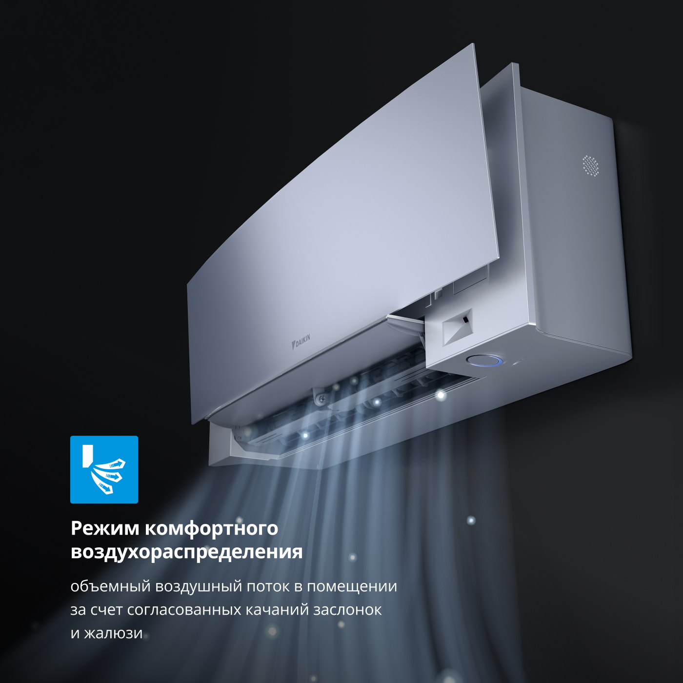Функциональные возможности Daikin Emura 3 включают интеллектуальный 2-зонный датчик Intelligent Eye, который определяет присутствие людей в помещении и регулирует поток воздуха для наибольшей эффективности обогрева или охлаждения. В случае отсутствия движения система автоматически переходит в энергосберегающий режим. Многоступенчатая очистка воздуха с фильтром с ионами серебра снижает уровень аллергенов, пыли и запахов, обеспечивая чистый воздух.