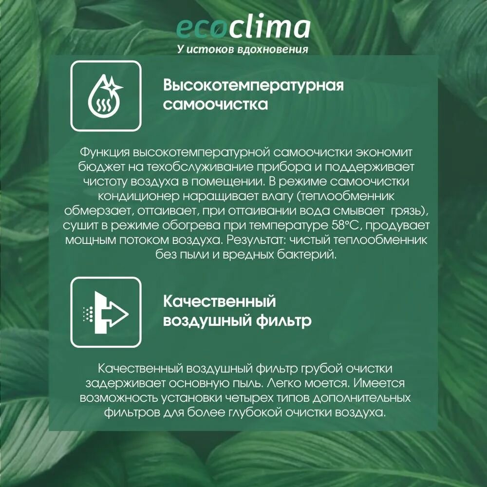 Сплит-система Ecoclima идеально подходит для жилых и офисных помещений, где важно создать стабильный микроклимат. Угольные и фотокаталитические фильтры очищают воздух от пыли и аллергенов, а функция самоочистки поддерживает внутренние компоненты в чистоте, продлевая срок службы и повышая надежность работы оборудования.