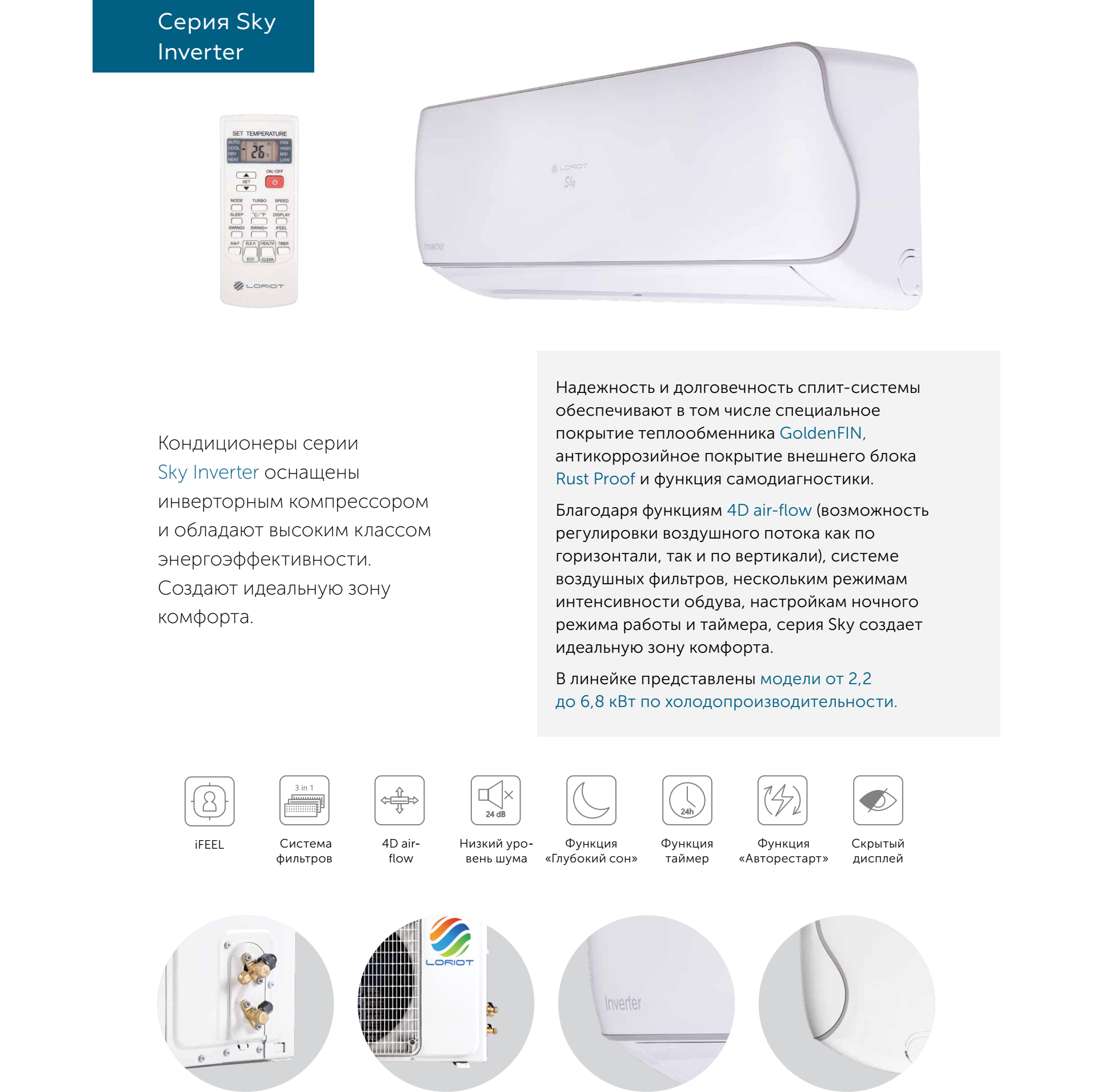 Сплит-система оборудована новейшими технологиями, которые обеспечивают работу без лишних шумов и вибраций. В процессе производства применяются передовые решения в изготовлении теплообменников, плат управления и пластиковых элементов, что гарантирует длительный срок службы и надёжность устройства.