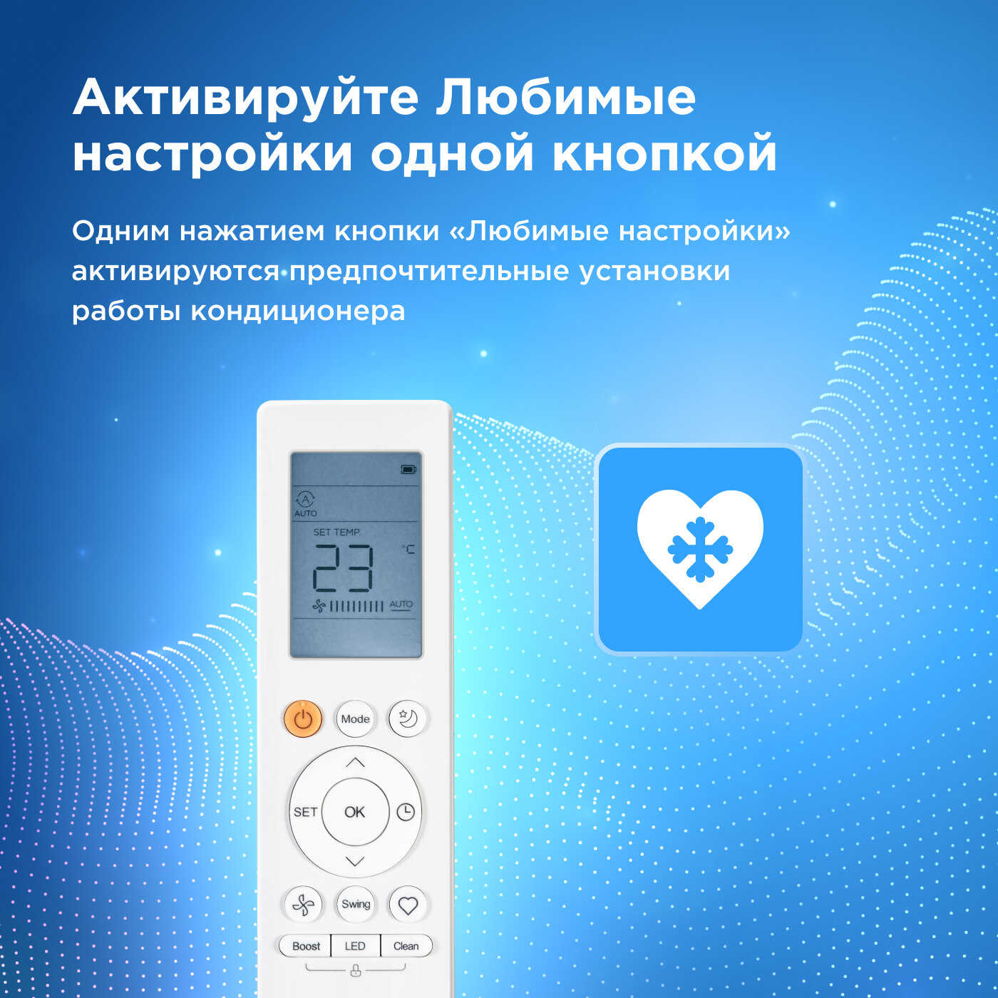 Для удобства использования сплит-система предлагает ряд режимов, таких как «Любимые настройки», Follow Me для поддержания комфортной температуры в близости от пульта ДУ и режим «Сон», увеличивающий комфортность ночного отдыха. Также имеются функции самоочистки внутреннего блока, самодиагностики и автозапуска после сбоя питания. Сплит-система предлагает обширные возможности для управления климатом, включая контроль уровня влажности и функцию Турбо для быстрого охлаждения.