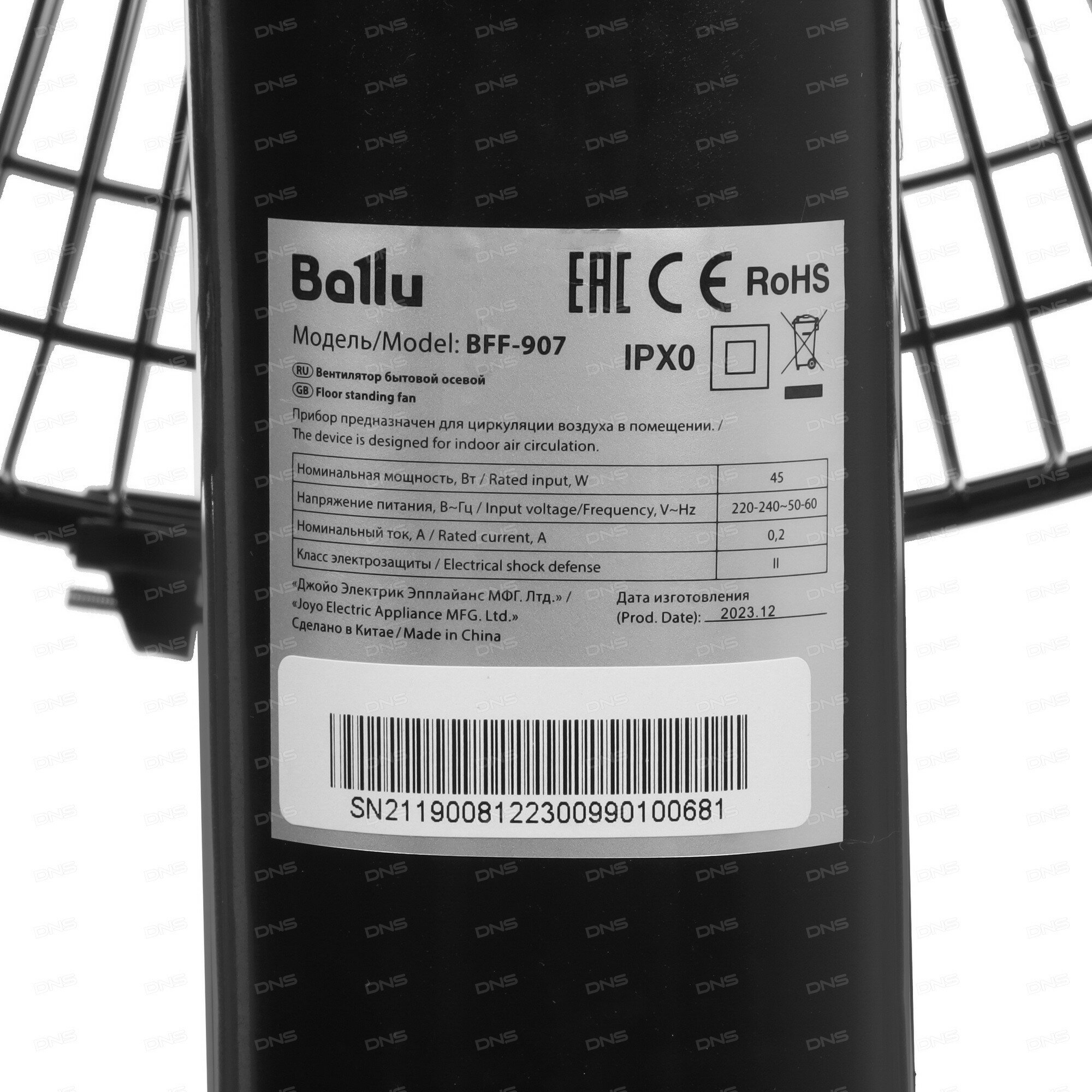 Устройство работает от сети 220-240 В и оснащено сетевым кабелем с вилкой. Класс пылевлагозащищенности IPX0 гарантирует безопасность использования вентилятора в бытовых условиях.