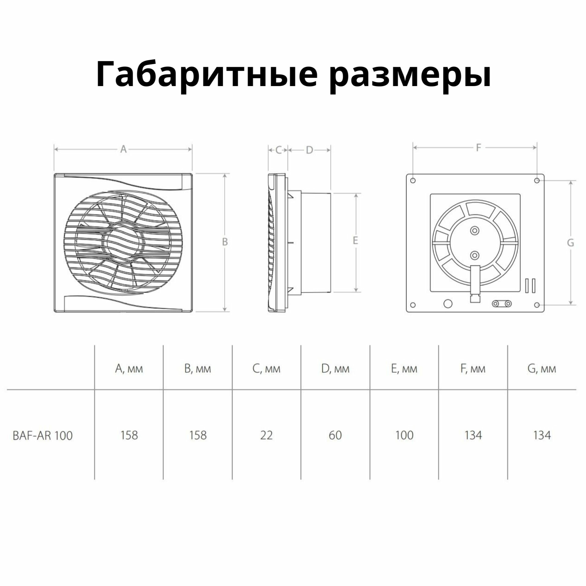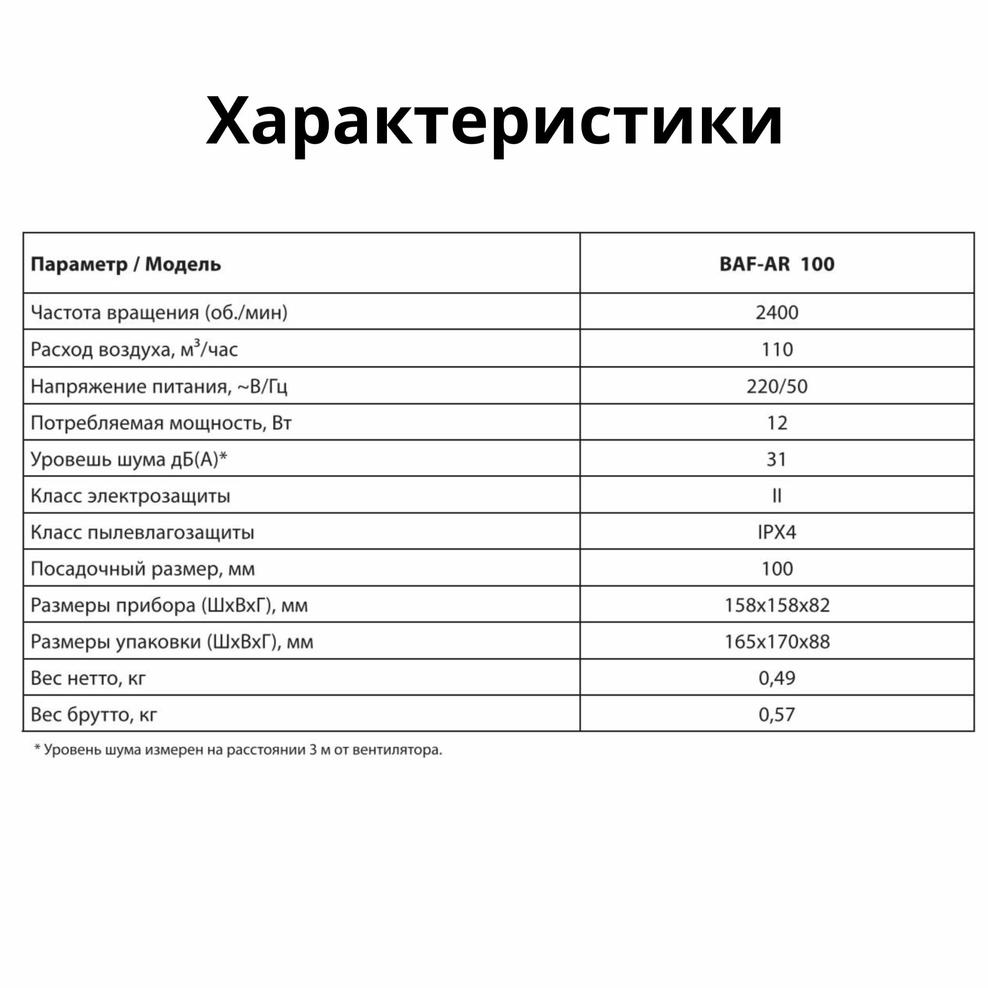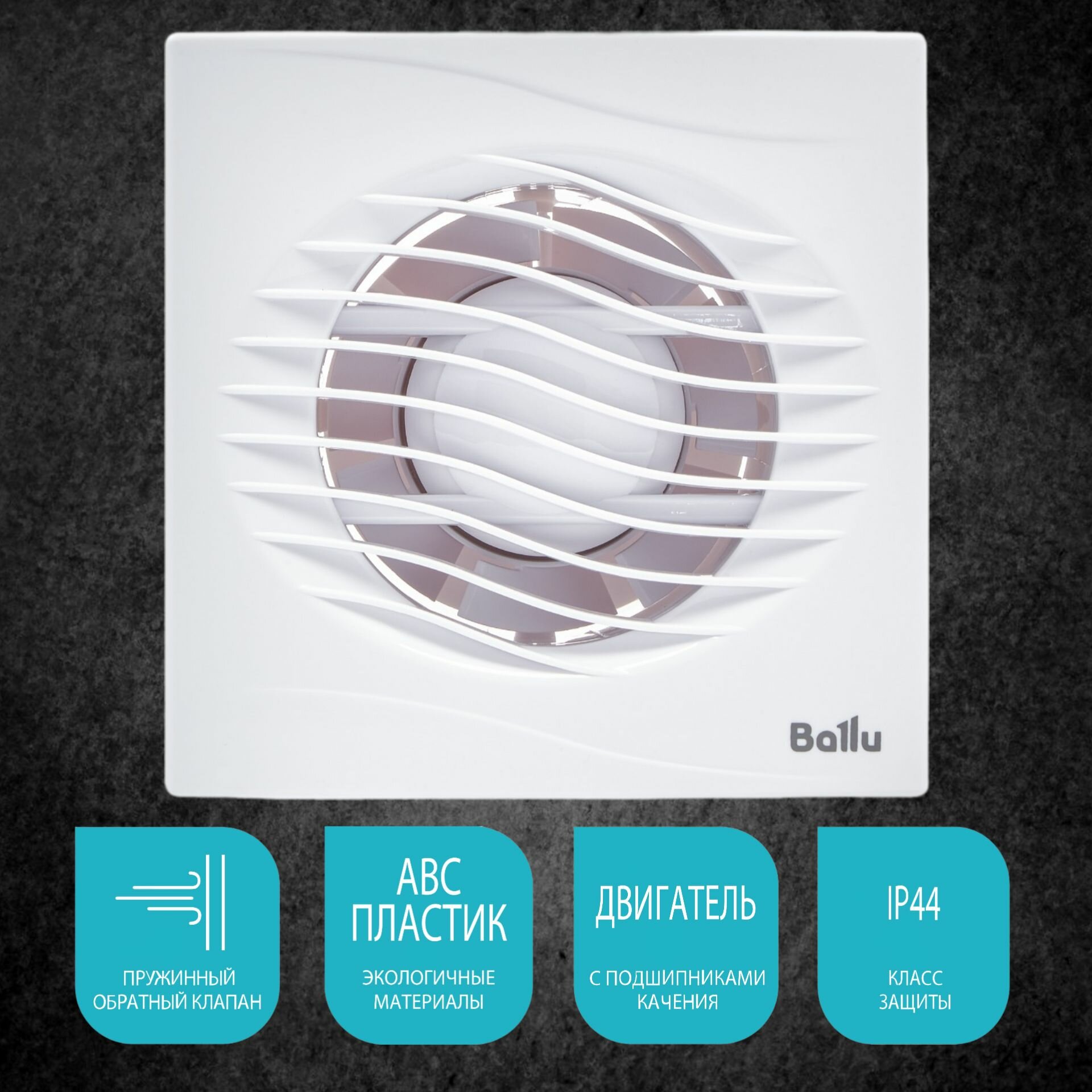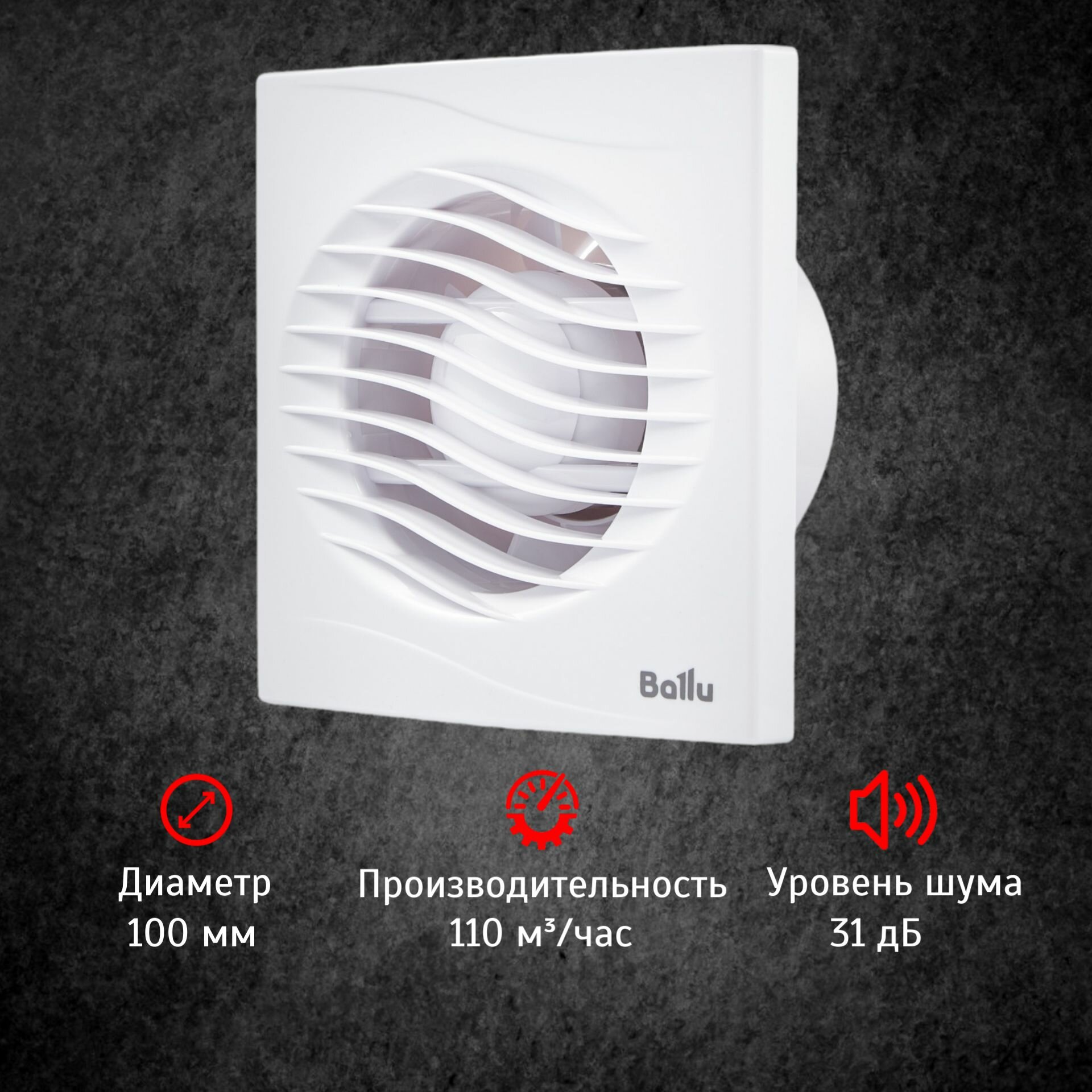 Вентилятор вытяжной Ballu BAF-AR 100, D100 мм, 31 дБ, 110 м3/ч, обратный клапан, цвет белый